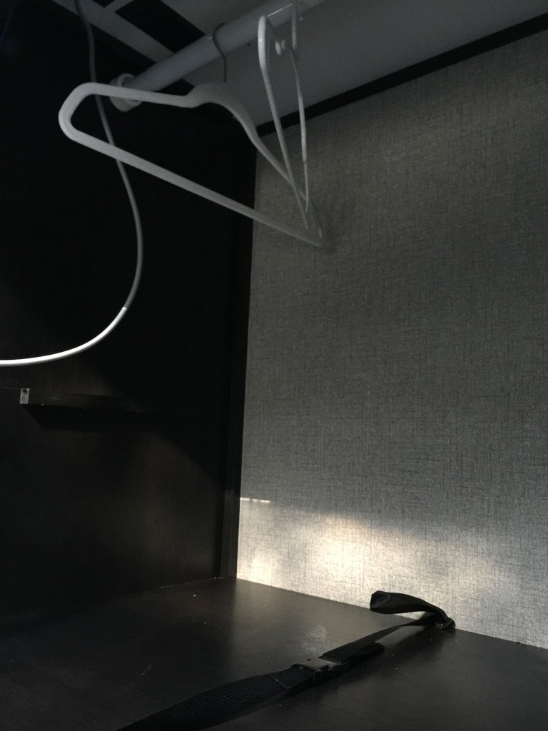 The other problem was not having a closet! I removed the shelving, the top drawers from behind the television (which is on a swivel making a perfect door) installed a curtain pole and there you go – closet! In this picture I am making sure a hanger will fit. It did. They do. I’m amazing ;)